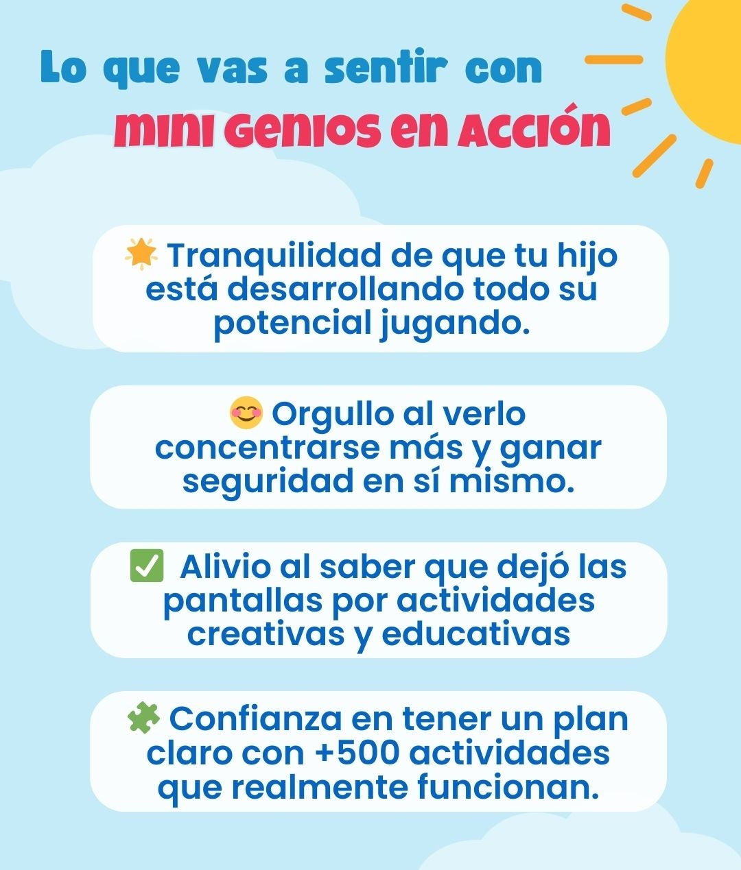Porque estamos tan seguros de que “Mini Genios en Acción” transformará la forma en que tu hijo aprende, que el riesgo lo asumimos nosotros 😉💪.